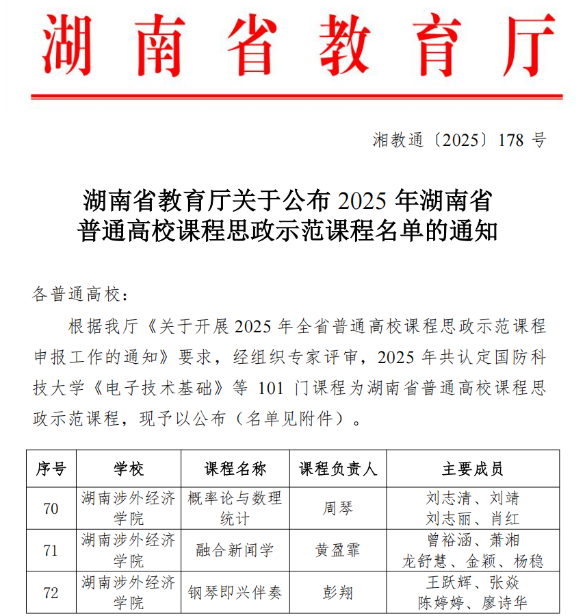 喜报!我校3门课程获批2025年湖南省普通高校课程思政示范课程
