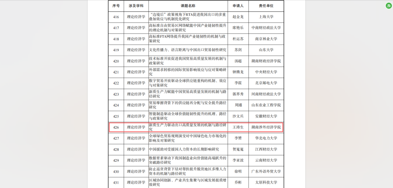 2024年9月14日,全国哲学社会科学工作办公室发布了《关于2024年国家社会科学基金年度项目立项名单的公示》。我校商学院王涛生教授主持的《新质生产力驱动出口高质量发展的机制与路径研究》项目脱颖而出,成功获批立项,我校也成为2024年度湖南省内唯一一所获批此类项目的民办本科院校。至此,我校已累计获批国家社会科学基金项目4项。