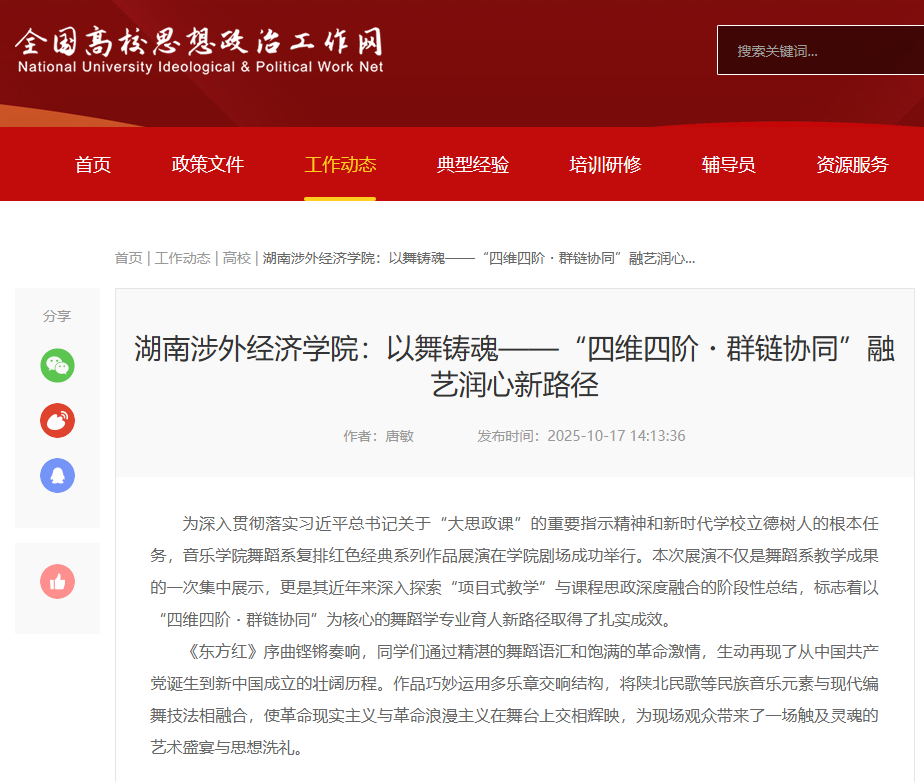 近日,全国高校思想政治工作网以《湖南涉外经济学院:以舞铸魂——“四维四阶・群链协同”融艺润心新路径》为题,报道我校音乐学院舞蹈系的教学创新实践案例。