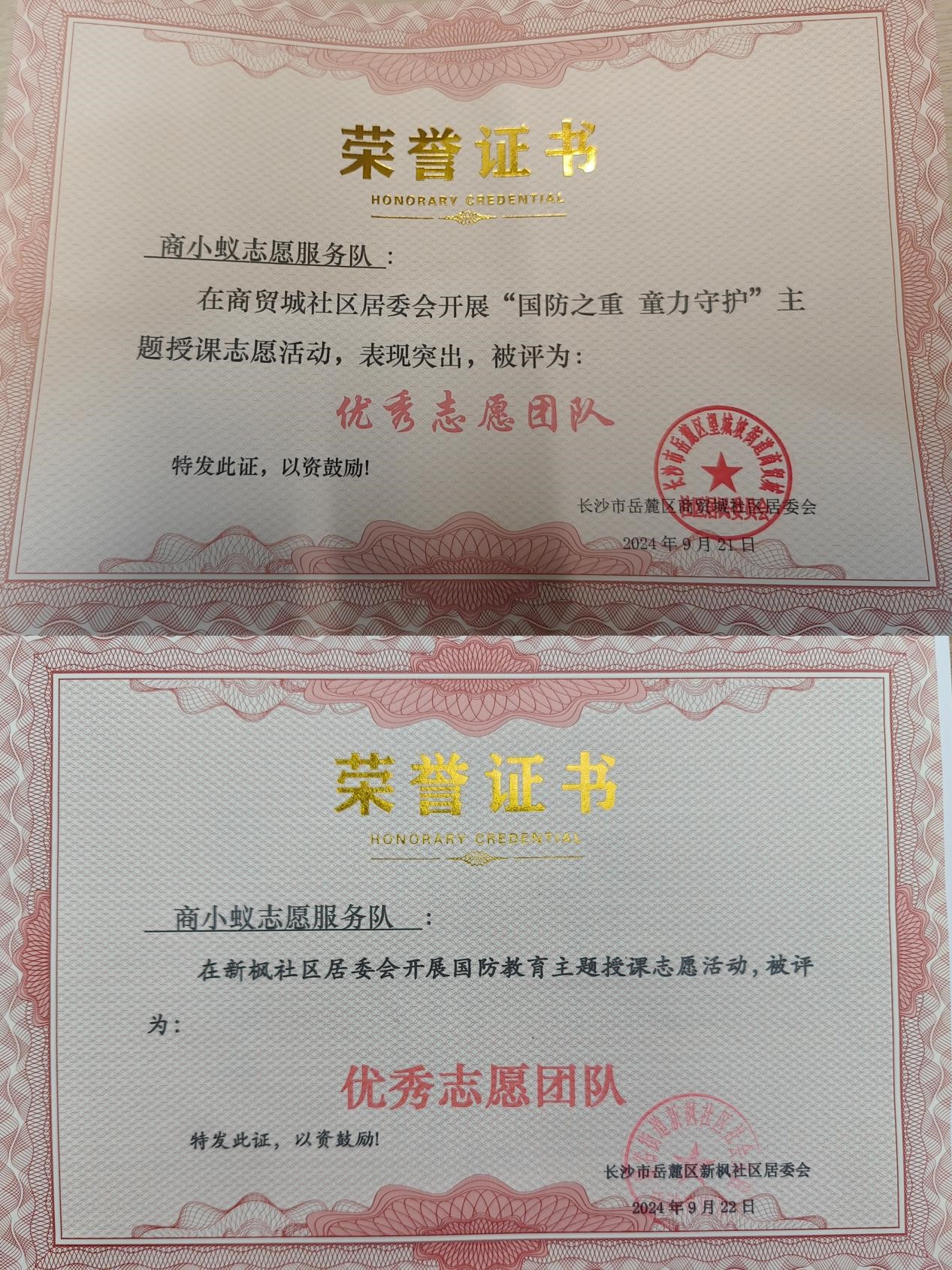 本次国防教育志愿活动,既发扬了了志愿服务风尚,弘扬了爱国主义精神,又推进了学生社会实践能力的提升。商贸城社区居委会和新枫社区居委会负责人对商小蚁志愿服务队的此次活动给予了高度评价,并为其颁发了“优秀志愿团队”荣誉证书。