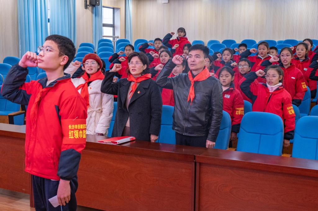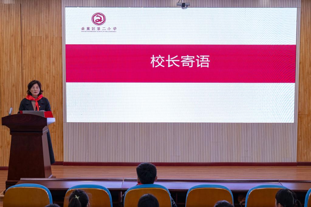 活动开始前,岳麓区第二小学全体大队委员在大队长李烨阳的号召下庄严宣誓,用铿锵有力的誓言展现出新时代青少年的爱国热情和昂扬风貌。随后,皮校长勉励孩子们要从百年党史中汲取智慧和力量,将个人理想与民族复兴的伟大事业紧密结合。