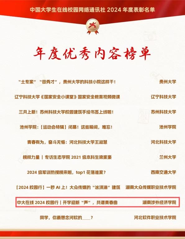 在2024年度中国大学生在线校网通及校园行表彰活动中,我校喜获多项荣誉。湖南涉外经济学院党委宣传部获“优秀组织单位”,易班发展中心获“优秀校网通站”;黄振老师获“校网通优秀指导教师”和“校园行新星指导老师”;潘府莹同学获“优秀学生编辑”,推文《开学迎新“声”, 共谱青春曲》入选“年度优秀内容榜单”。