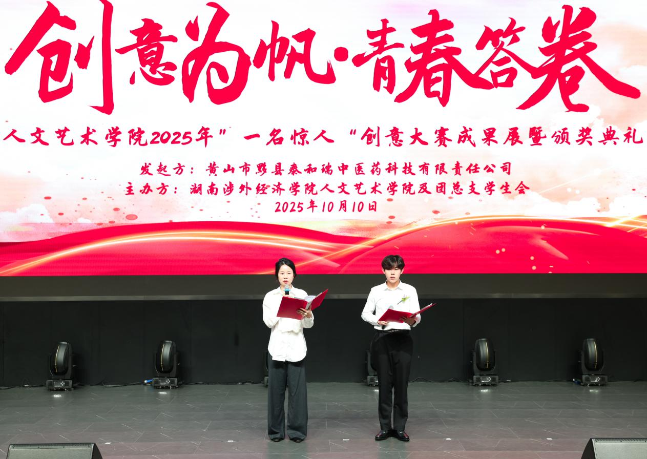 10月10日下午,我校人文艺术学院与黄山市黟县泰和瑞中医药科技有限责任公司联合举办的“创意为帆·青春答卷”2025年“一名惊人”创意大赛成果展暨颁奖典礼,在学校世纪讲堂隆重举行。人文艺术学院党总支书记廖立彬、环境艺术设计系主任李麟、企业代表陈丽萍女士及人文艺术学院师生代表共同出席了活动。