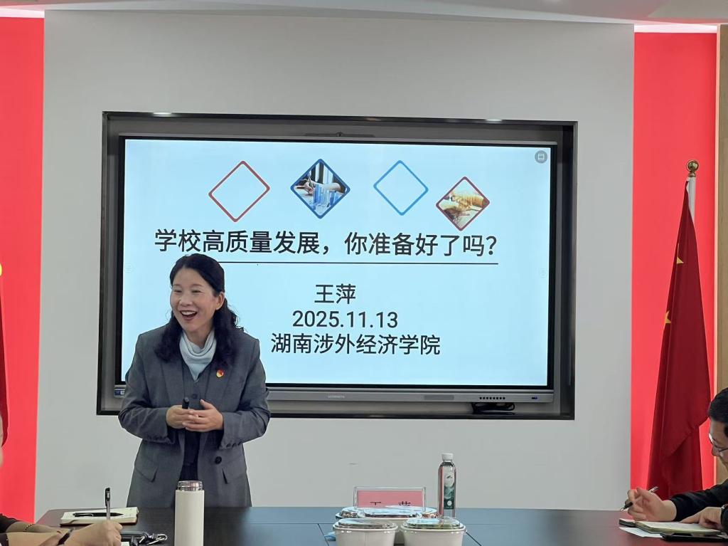 11 月 13 日下午,我校副校长王萍在马克思主义学院举办以 “学校高质量发展,你准备好了吗?”为题的专题讲座。讲座由马院院长邓青林主持,全体教师围绕主题深入研讨,凝聚发展共识。