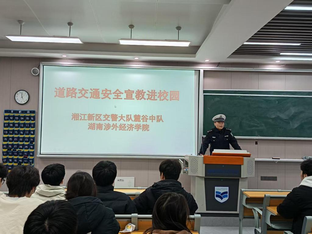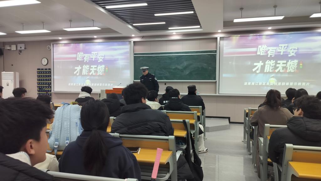 为了进一步加强校园交通安全宣传教育,切实提升同学们的交通安全意识、规则意识和自我防护能力,深化第14个全国交通安全日“文明交通,礼行天下”主题精神,有效预防和减少道路交通事故发生,12月26日,我校安全保卫处邀请湘江新区交警大队麓谷中队民警开展交通安全进校园主题宣传教育活动。各二级学院选派学生代表现场参与活动。