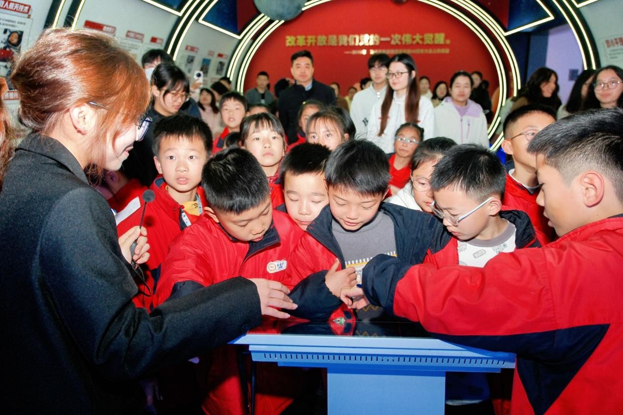 活动现场,“锋语者”志愿服务队成员与小学生一对一结对,以英语问候开启互动,快速拉近跨龄距离。在讲解员与志愿者引导下,师生及家长参观以“薪火相传、凝心铸魂”为主题的党建与思政教育基地,依次走进“开天辟地”“改天换地”“翻天覆地”“惊天动地”四个展厅,通过实景展陈、故事讲解、互动交流,系统学习百年党史。