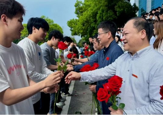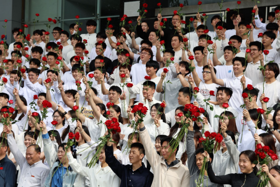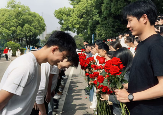 活动伊始,庄重的“谢师礼”温情上演,毕业生们依次向老师鞠躬致敬,感念师恩;随后的“祝福礼”中,老师们为每位毕业生送上红玫瑰,寓意前程似锦、一路繁花;在“感恩礼”环节,全体毕业生齐声喊出“感恩母校培养,今天我以涉外为荣,明天涉外以我为荣”的铿锵誓言,告白母校。最后,师生们集体合影留念,定格下这温馨而珍贵的毕业瞬间。