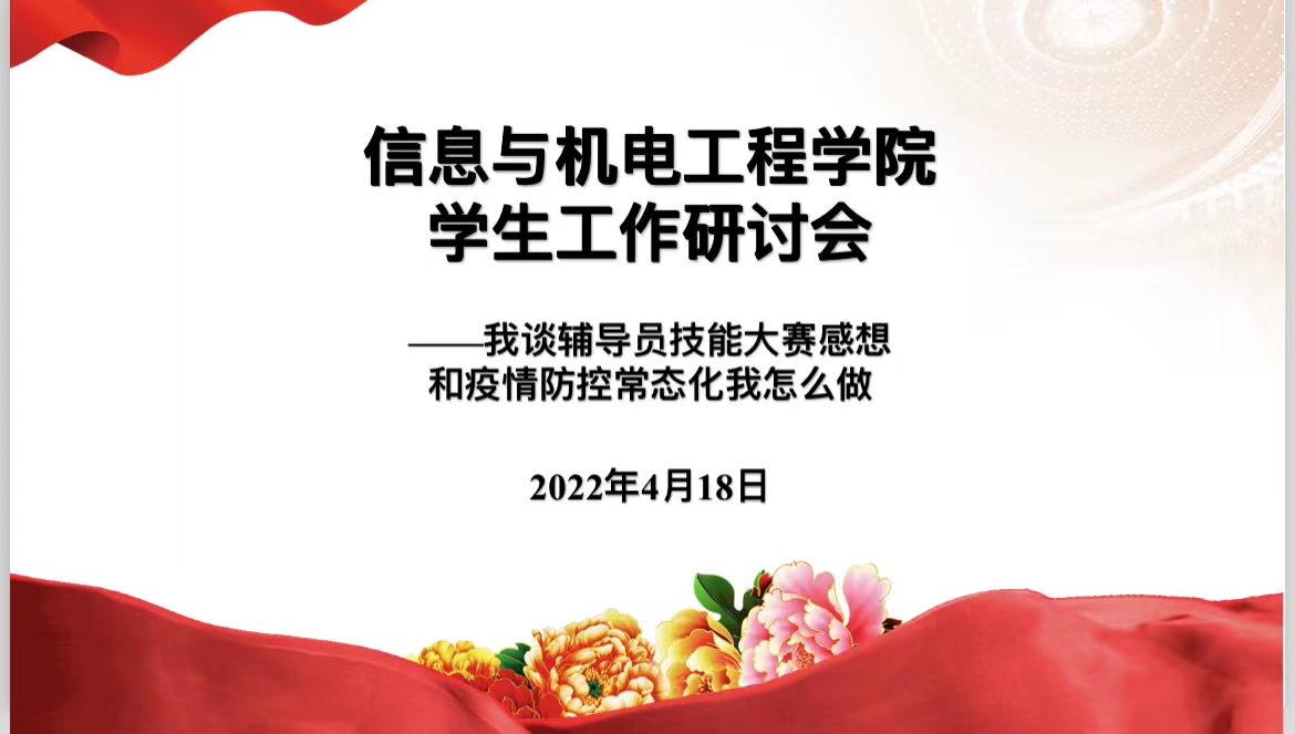 至善至美的涉外,学子星罗,师者云集;勇担使命的工院,真抓实干,生机浩荡。4月18日下午,我校信息与机电工程学院学生工作研讨会暨第九届高校辅导员素质能力大赛颁奖仪式,在八教108室如期举行。学校副校长鞠晨曦、信息与机电工程学院院长陈继锋与会指导,学院党总支书记廖立彬主持,全体辅导员参加。