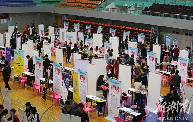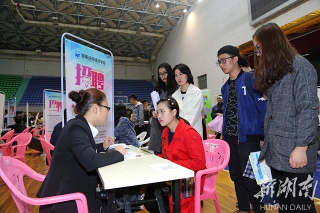 4月26日,求职学生在和用人单位交流。当天,湖南涉外经济学院2017年春季招聘会在该院体育馆举行。包括三一重工、蓝思科技、招商银行等省内外知名企业,近80家用人单位为400多名毕业生带来了数百岗位。据悉,该学院采取了“互联网+就业服务”的招聘模式。用人单位通过涉外云就业服务平台发放的电子邀请函报名,由学校根据对各学院尚未就业的毕业生进行的摸底调查,以及用人单位的专业分布和岗位需求,从200多家报名企业中遴选了70多家单位参加现场招聘,参会学生通过扫描二维码入场。招聘会结束后,用人单位网上填写调查问卷,对参会学生的性别、学历、专业、毕业学校,以及用人单位的招聘情况和建议等信息进行大数据分析,形成相关数据分析报表,提高了就业指导的精准度。邓建平 王琼芳 摄影报道